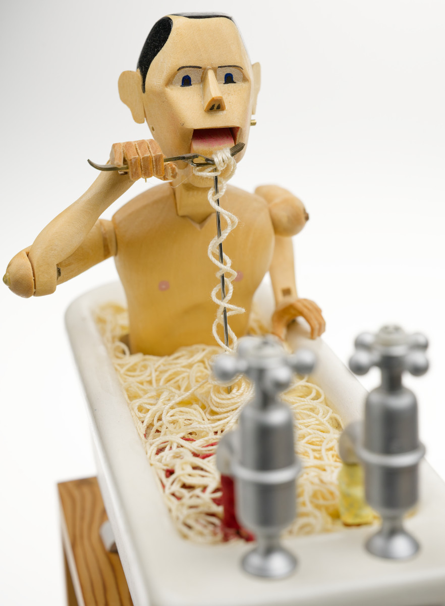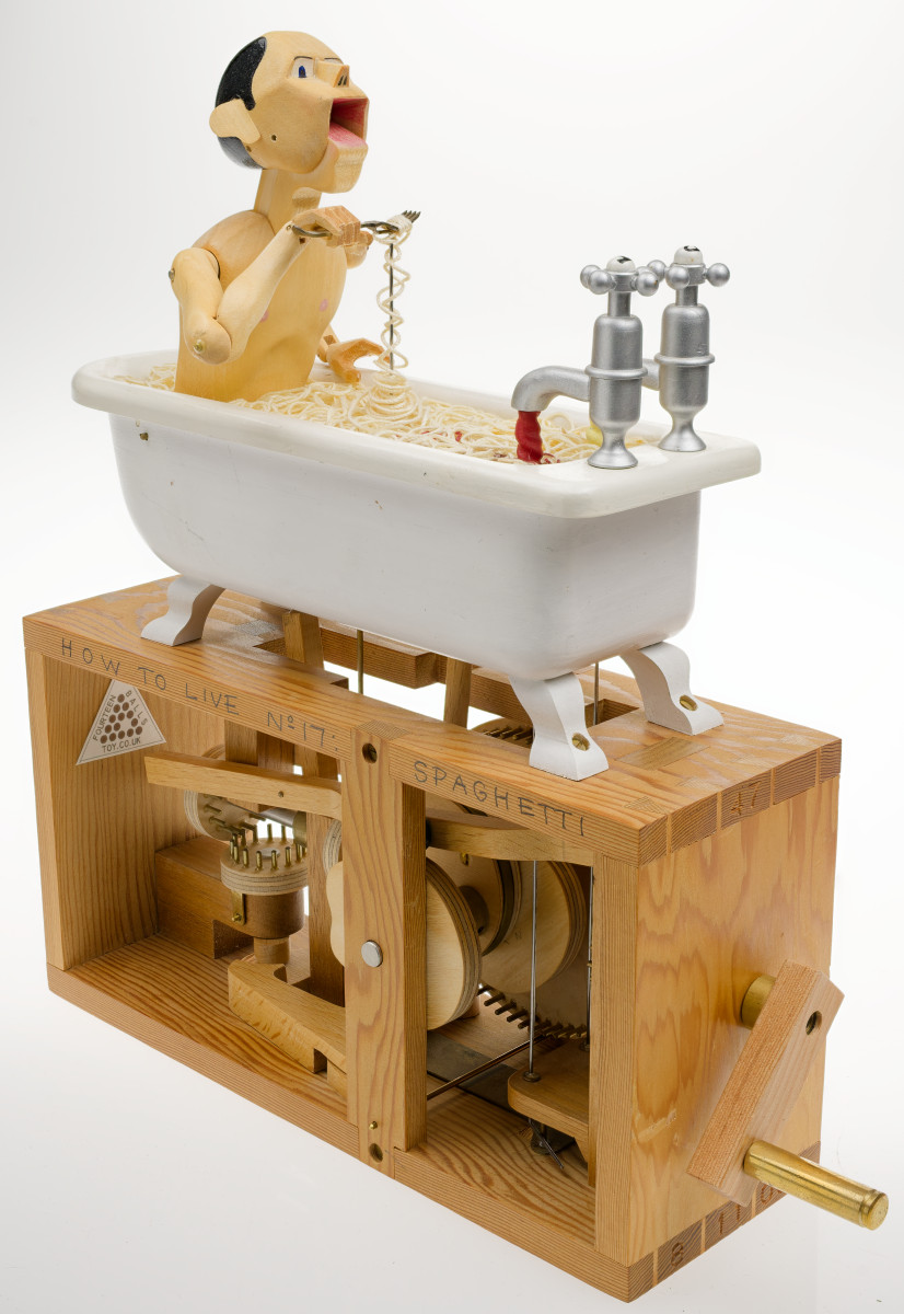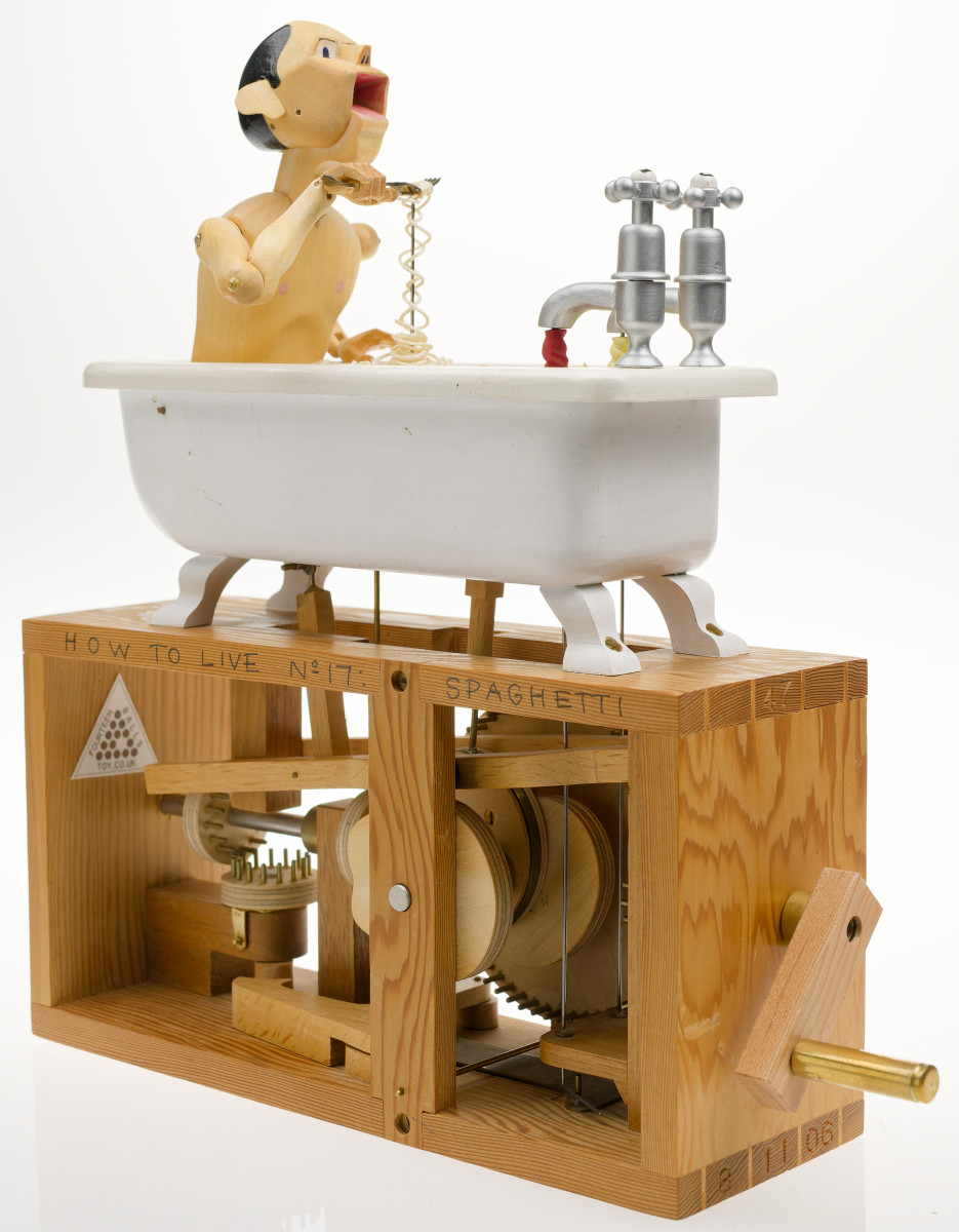 How to Live No. 17 Spaghetti. This man eating spaghetti in the bath is one of the most recognised pieces in the CMT collection. The original was part of the iconic Covent Garden display and the editions are a popular part of our touring exhibitions. This is a rare opportunity to add one to your own collection.