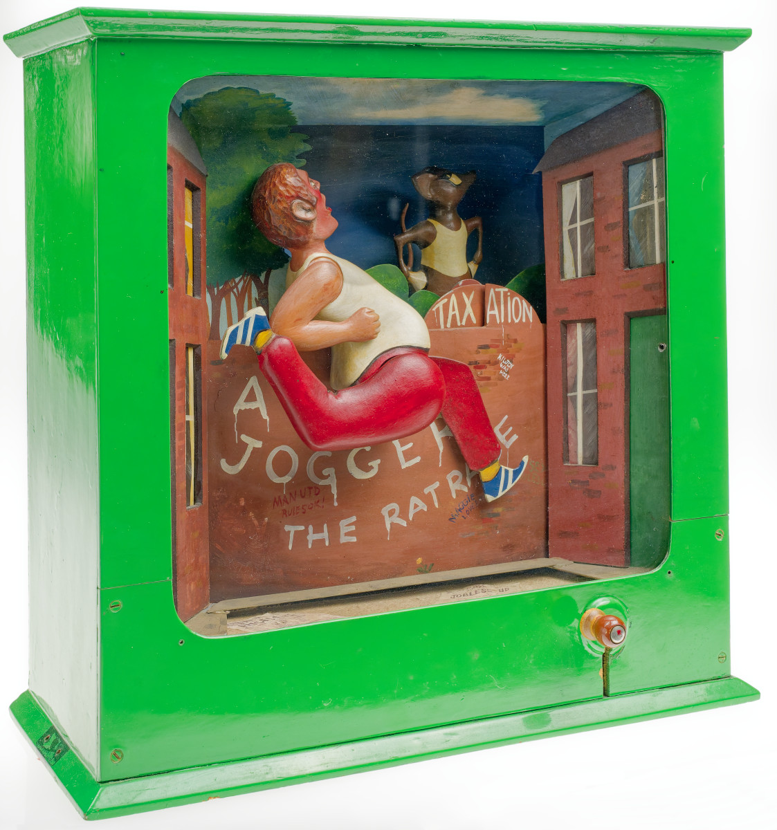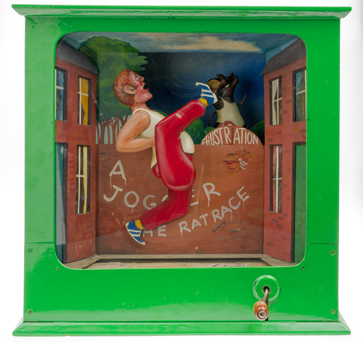 A jogger in the rat race. The rats change as the jogger progresses. They go from Taxation to Inflation to Frustration to Intoxication.