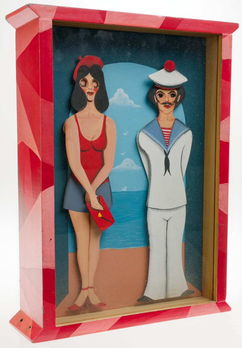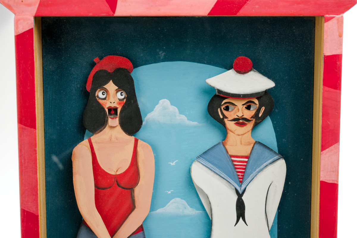 The sailor rudely pinches the woman’s bottom. She quickly knocks off his hat in return.