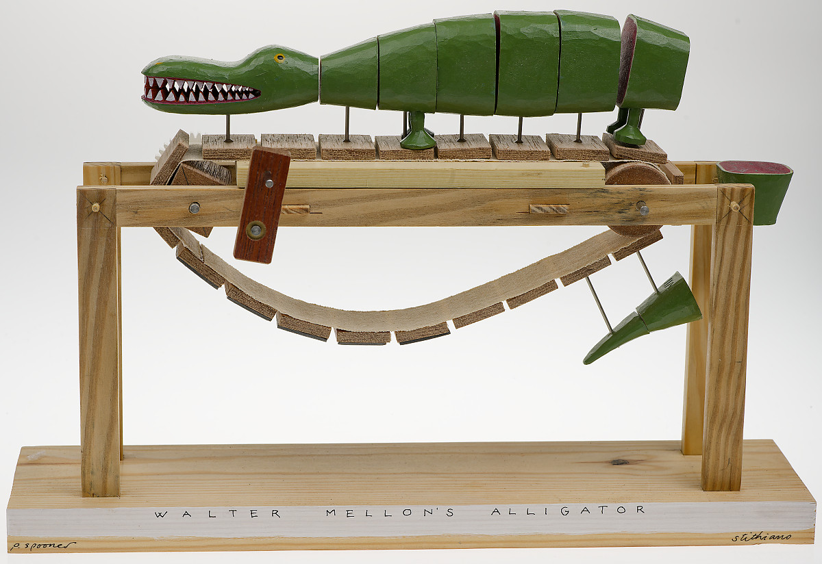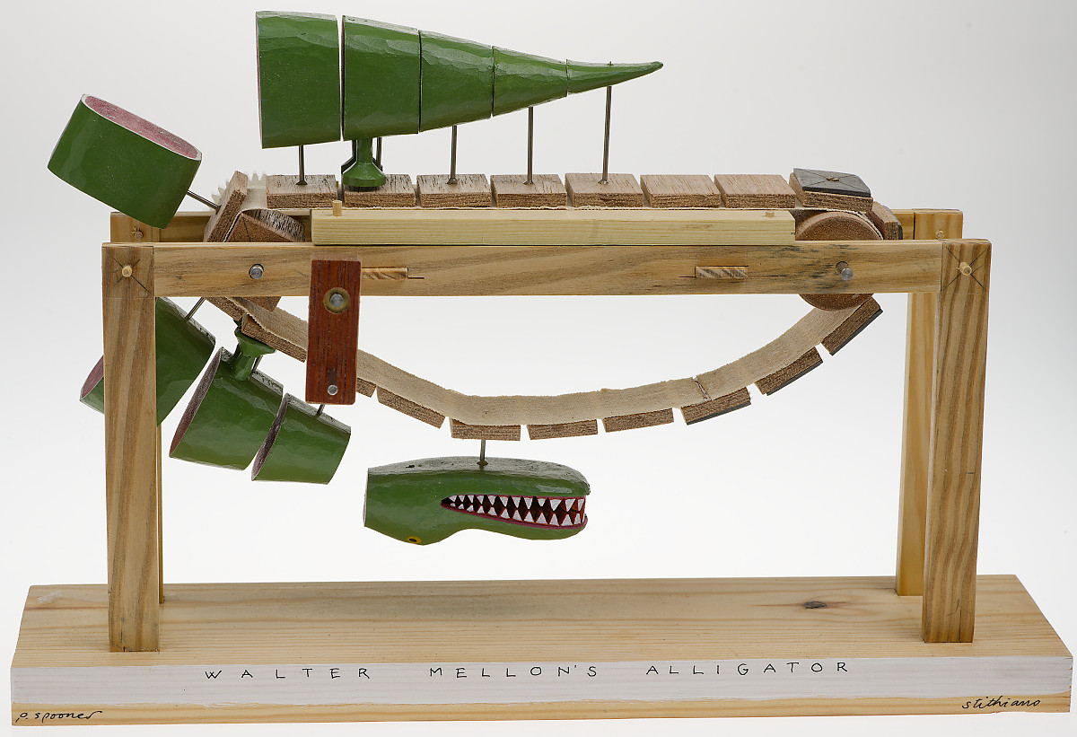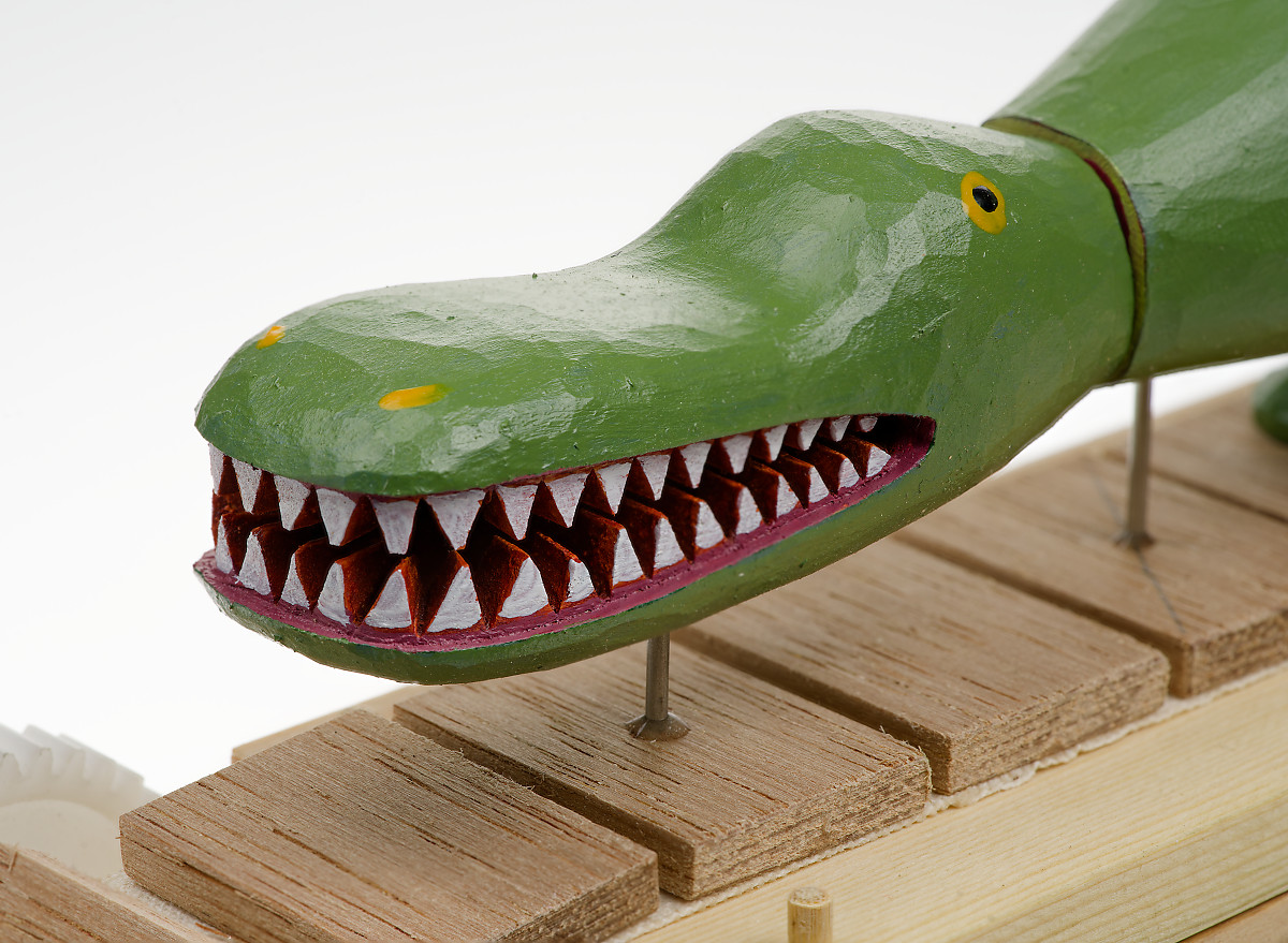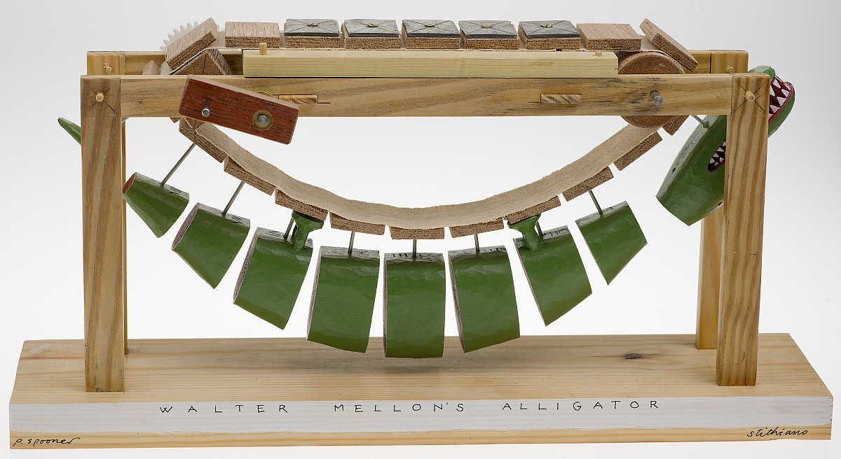“Third of a series of endless belt-based machines. I like the way the animal assembles and dismantles itself as it rounds each end of the track. The driver is a square sectioned sort of sprocket which transmits enough power to drive the belt on its own but when the alligator is attached the arrangement is unbalanced. The small slabs of lead that follow the animal around equalise the load. Lead is bad for you if chewed or otherwise ingested. This artwork is not a toy- safe enough if it’s kept away from anyone who might want to eat it.