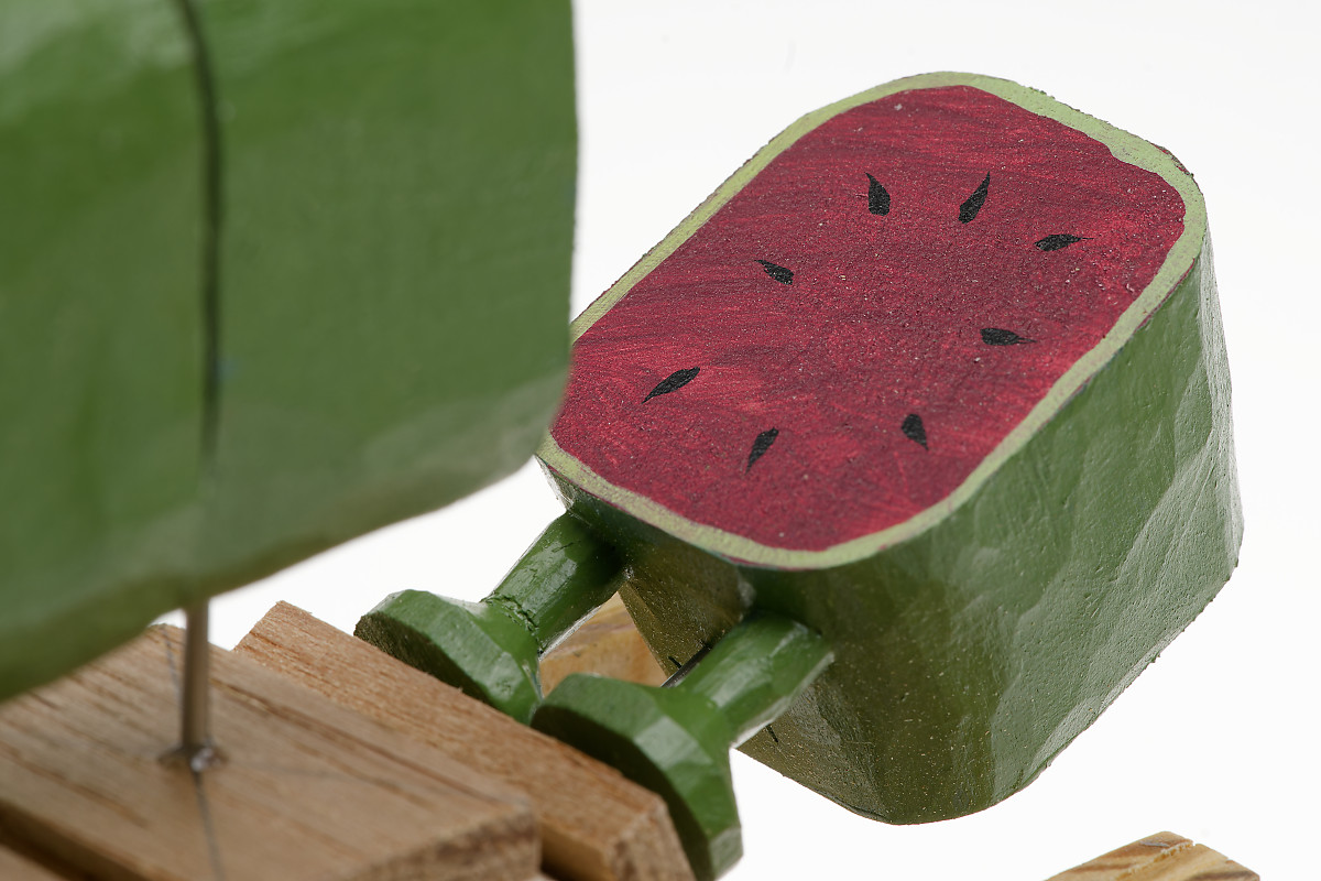 The cross-sectional paintwork is water melonic. Hence the title. It’s roughly copied from an old American toy I found in a book of American Vernacular Art. The original was articulated like the more usual wiggling snakes: split down the middle, cut into sections and reassembled with a flexible spine so that it moves snakily when tilted left and right. It’s a lovely thing and I’m glad I made a copy but rereading the book I noticed for the first time that the original is over a yard long which would present a tremendous pinch hazard if anyone got their finger between two sections while waggling its enormous body.” P. Spooner
