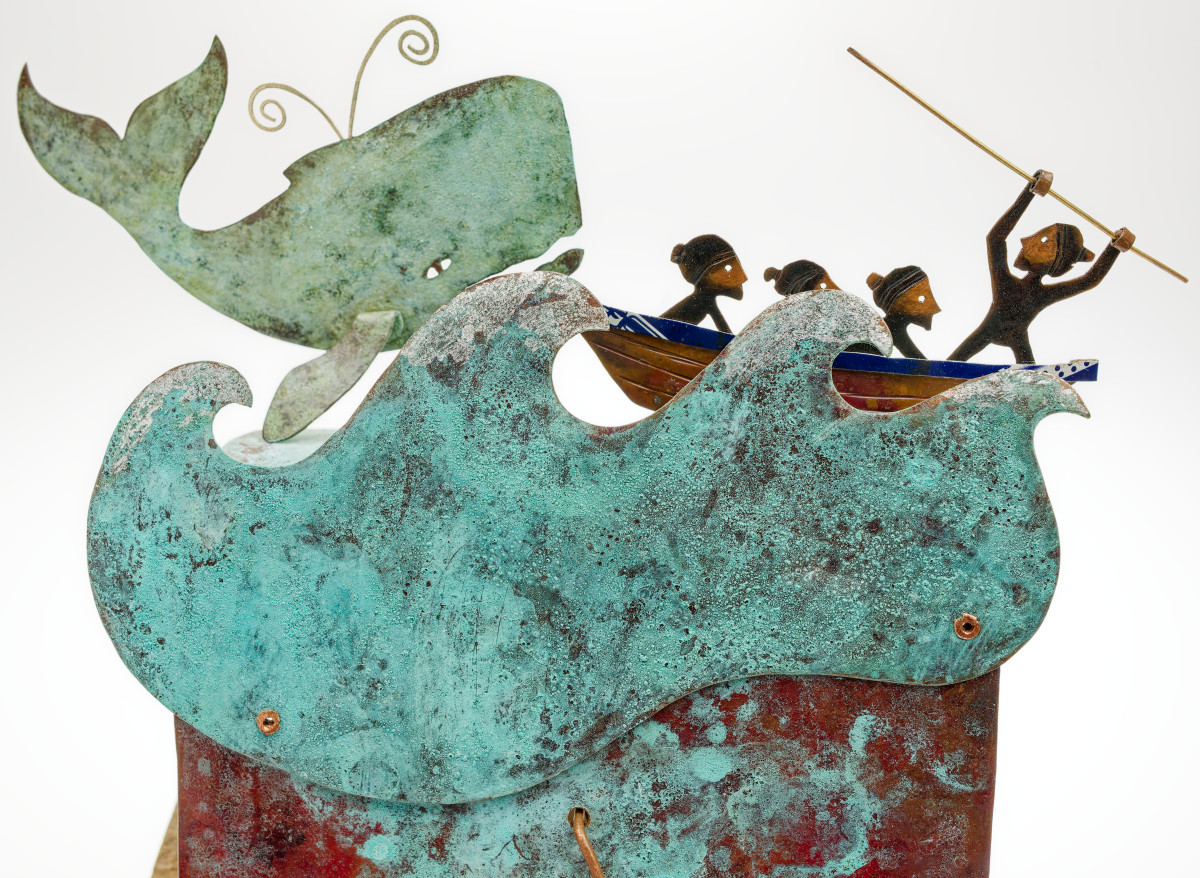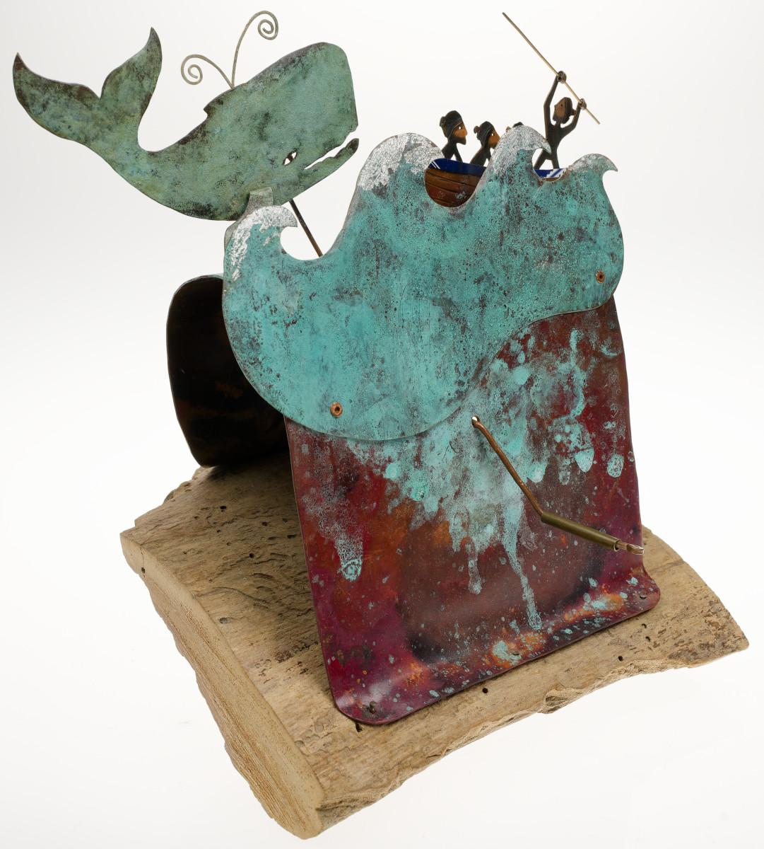 Patinated copper and brass on driftwood.